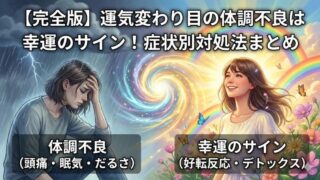 原因不明の眠気やだるさは、実は幸運の前兆かもしれません。この記事では、スピリチュアルな視点から運気の変わり目の体調不良に隠された重要なメッセージとデトックスの意味を解説します。運気の変わり目に体調不良が起きた際の正しい過ごし方や回復法を知り、不安を解消して新しいステージへの好転反応を味方につける方法を学びましょう。