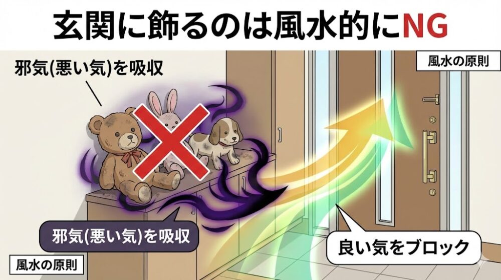 玄関にぬいぐるみを置くこと自体についての詳しい注意点や、運気を下げない飾り方のコツは、別記事『【風水】玄関にぬいぐるみはNG?運気を上げる飾り方と基本ルール』でよりくわしく解説していますので、あわせて参考にしてみてください。