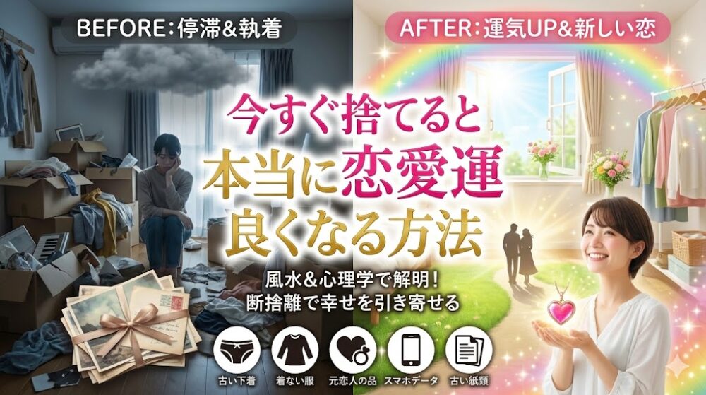 この記事では、具体的に何を捨てれば恋愛運がアップするのか、そしてどんな心持ちで断捨離を行えば良いのかを、私の実体験や友人の成功談も交えながら詳しくご紹介していきます。